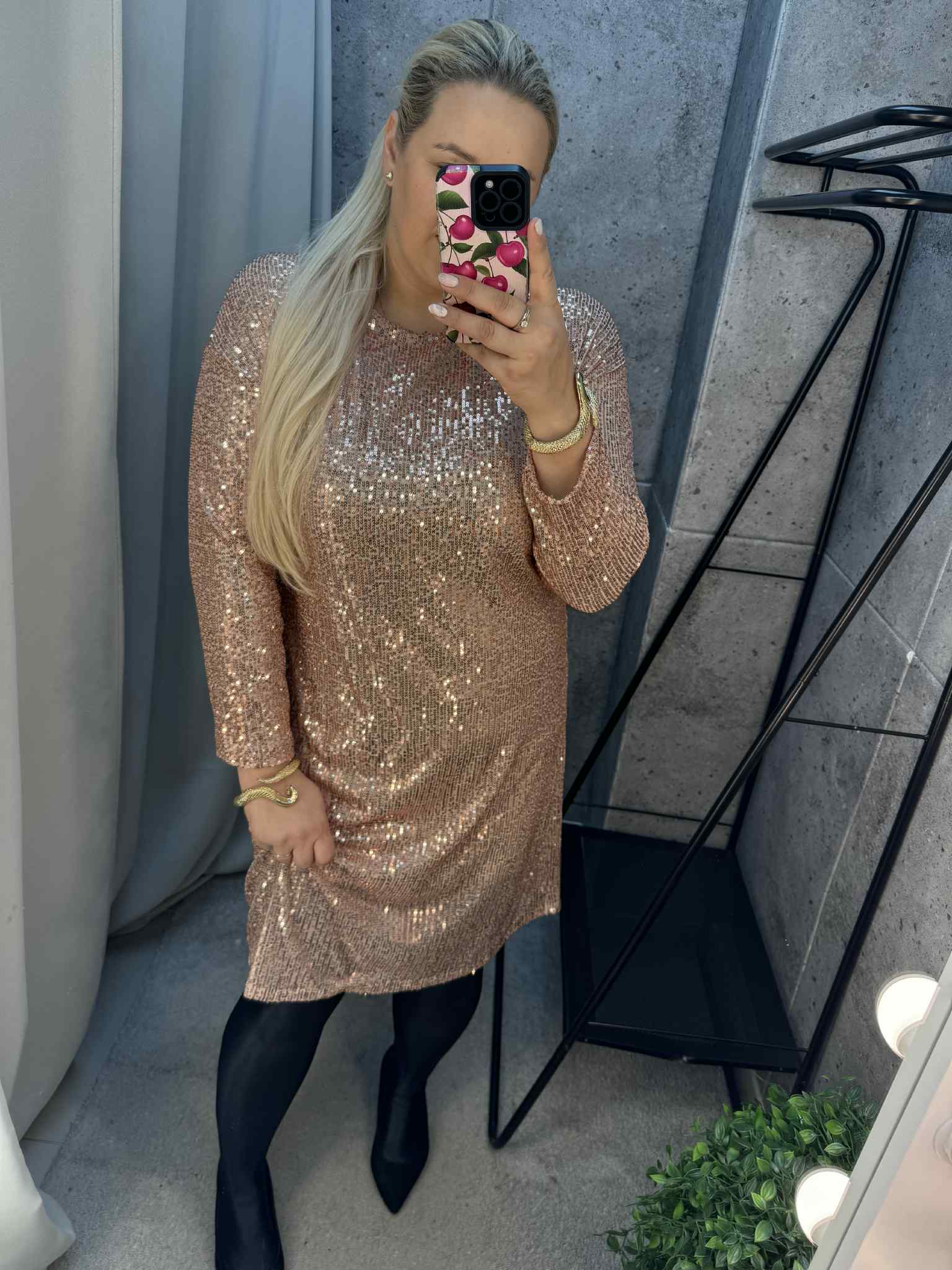 Žvynelių suknelė su kaspinu nugaroje. Laisvo kritiko. Su viskozės pamušalu. Tiks ir M/L, ir XL/XXL