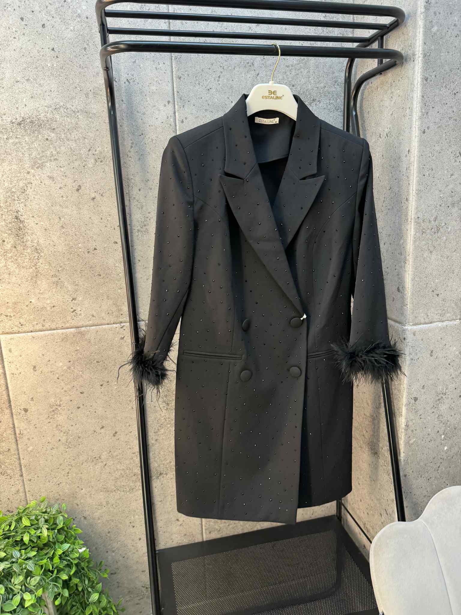 Švarkas/suknelė 36 dydis. Sudėtis - 80% viskozė, 15% poliesteris, 5% elastanas. Ilgis - 85, pečiai - 37, krūtinė - 43/47, liemuo - 39/41, klubai - 43/47, rankovės ilgis - 47, rankovės plotis- 18/20.