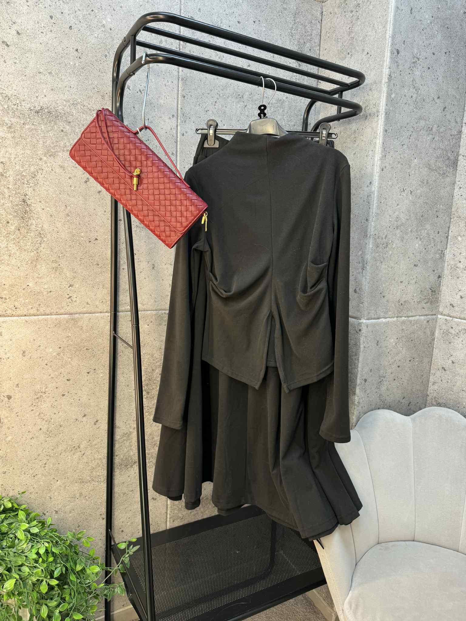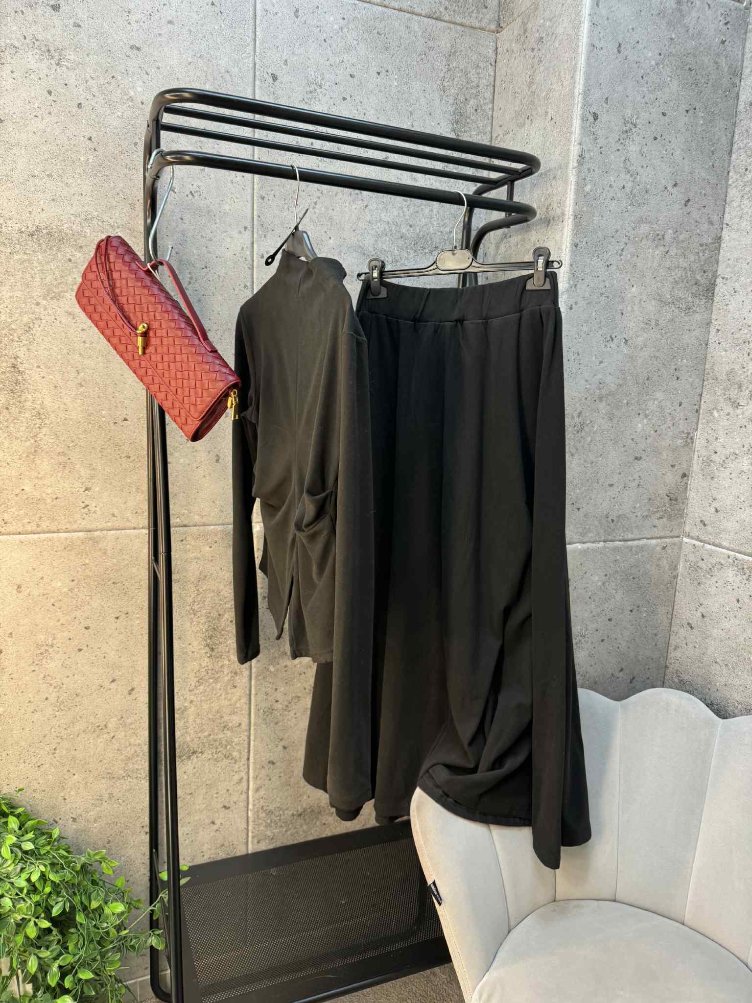 Kostiumas. Sudėtis - 65% viskozė, 30% poliesteris, 5% elastanas. Palaidinė ilgis - 52/60, pečiai - 40, krūtinė - 43/57, liemuo - 38/55, klubai - 41/59, rankovės ilgis - 67, rankovės plotis- 15/25. Sijonas ilgis - 90, juosmuo - 35/61, klubai - 82/112, sijono apačia-- 150/170.