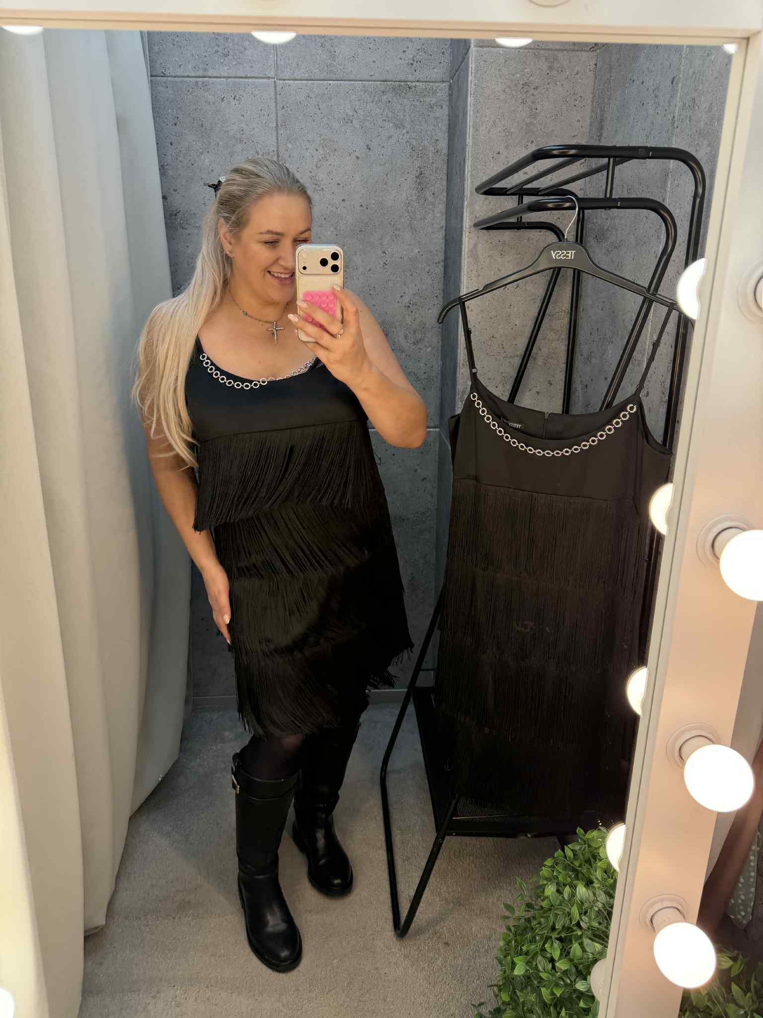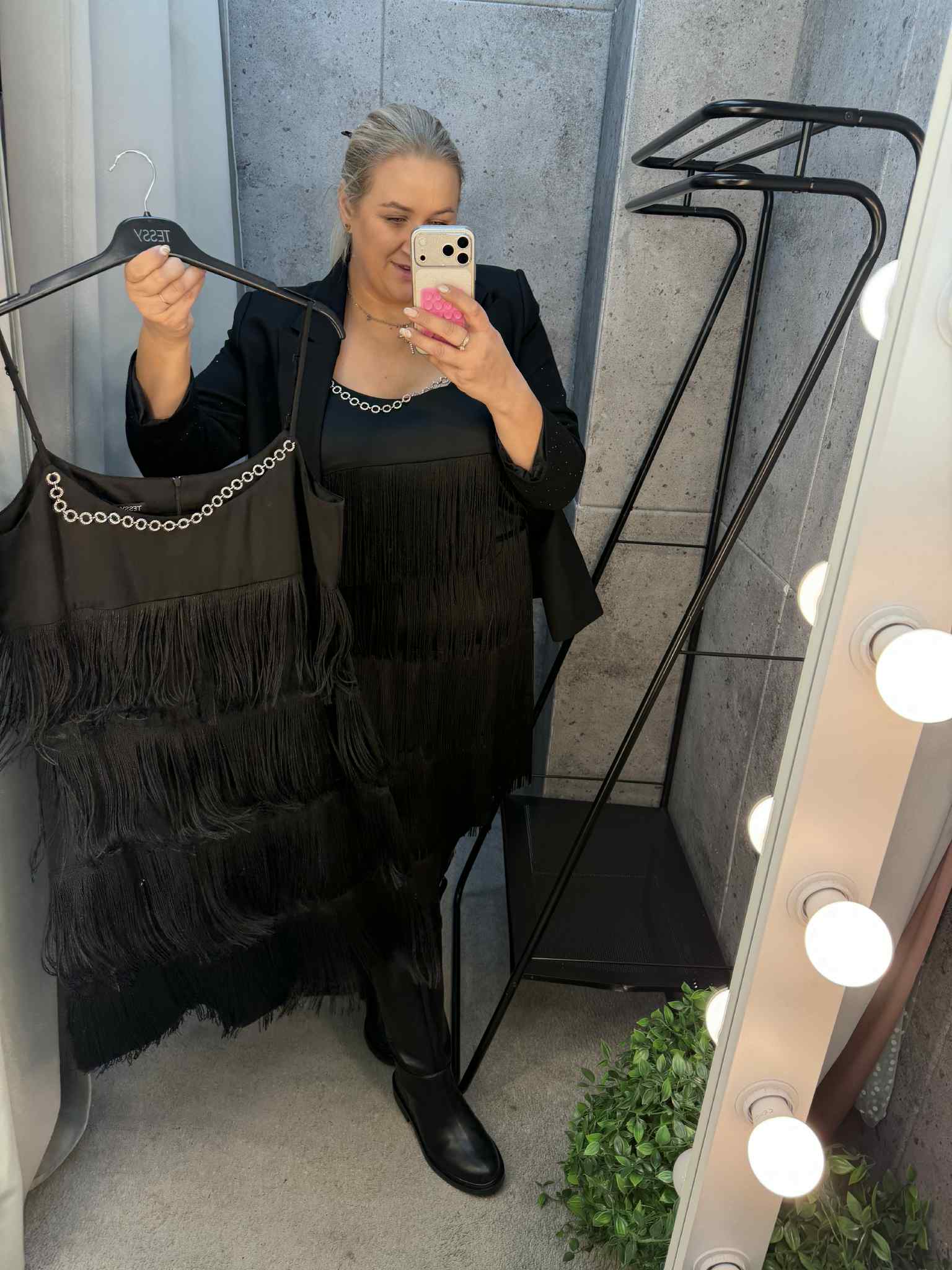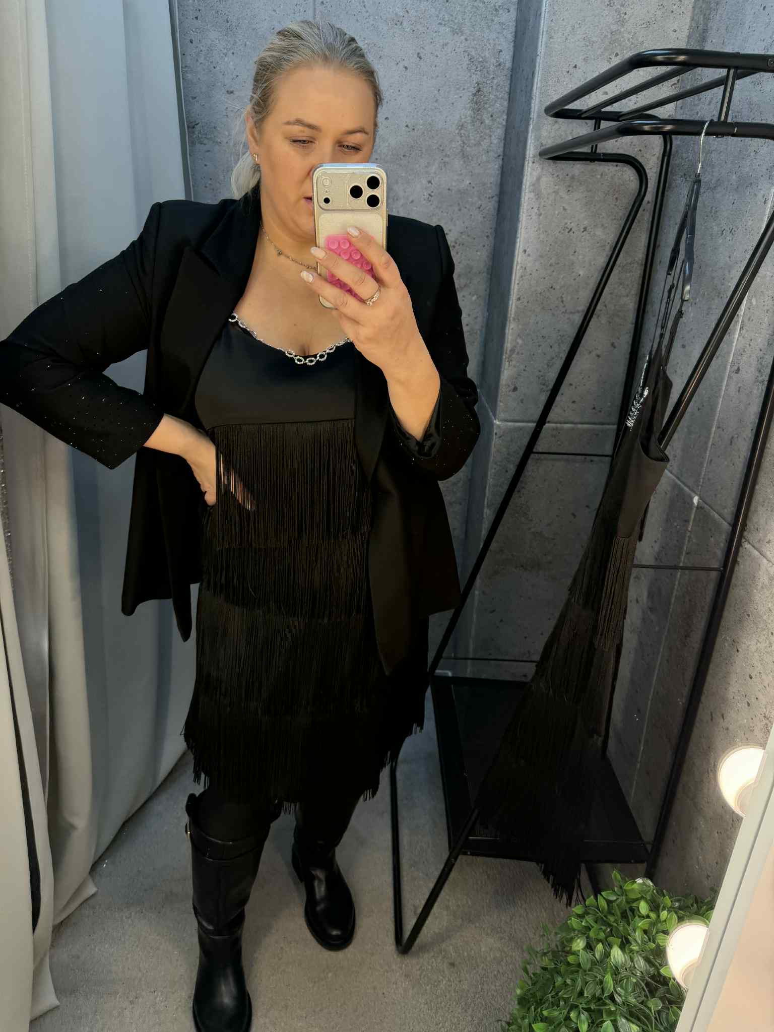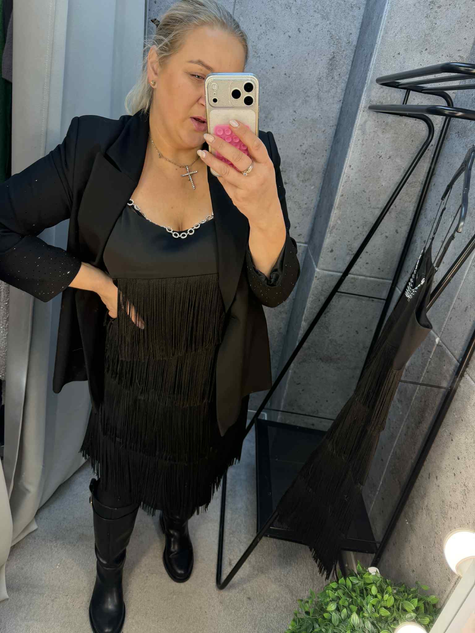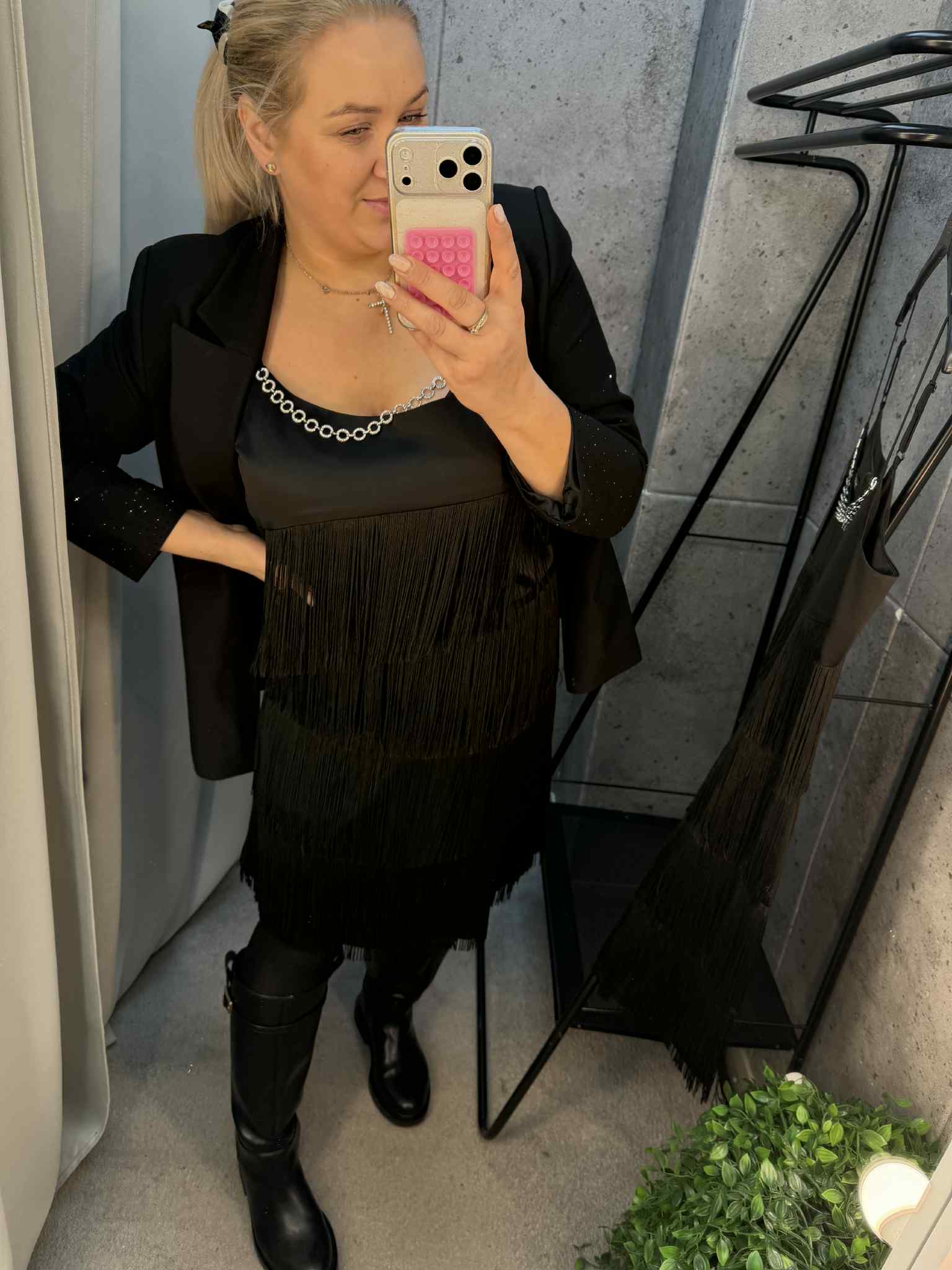 Suknelė 46 dydis. Sudėtis - 100% viskozė. Ilgis nuo krūtinės - 88, krūtinė - 57/59, liemuo - 52/55, klubai - 59/63, petnešos reguliuojasi.