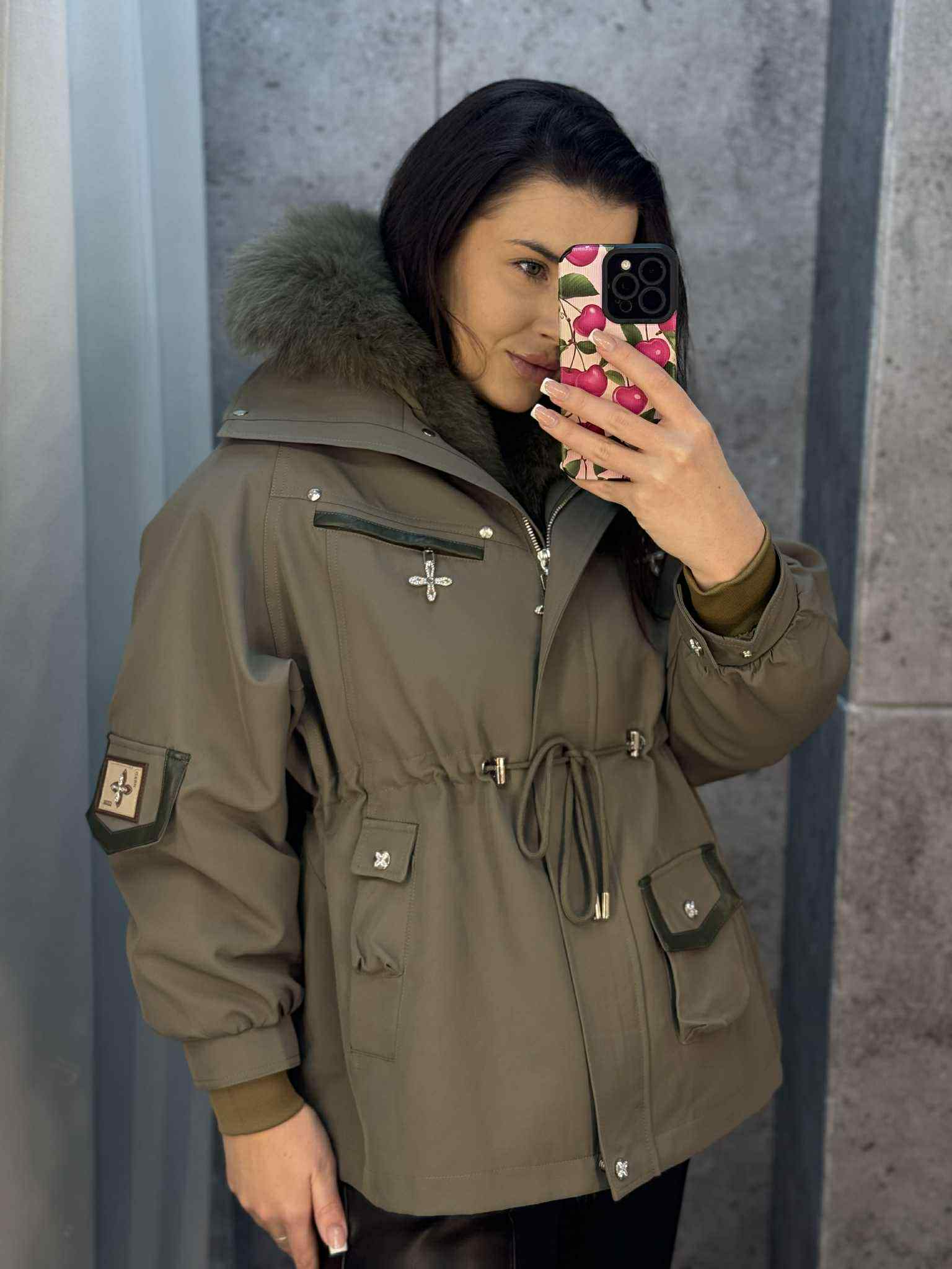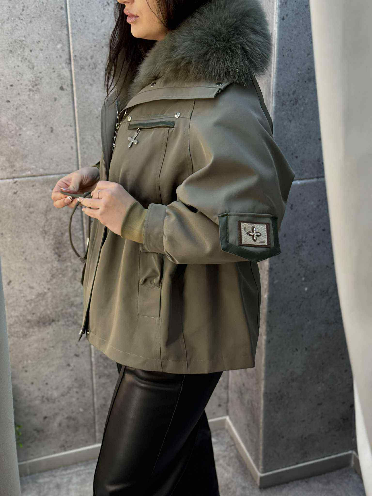 Ji M dydžio, tačiau, kaip oversized didinta. Tinka universaliai. Śonai susitraukia.Striukė M dydis. Ilgis - 68, pečiai oversized, krūtinė - 67/68, liemuo - 68/69, klubai - 69/70, rankovės ilgis - oversized, rankovės plotis- 29/30.