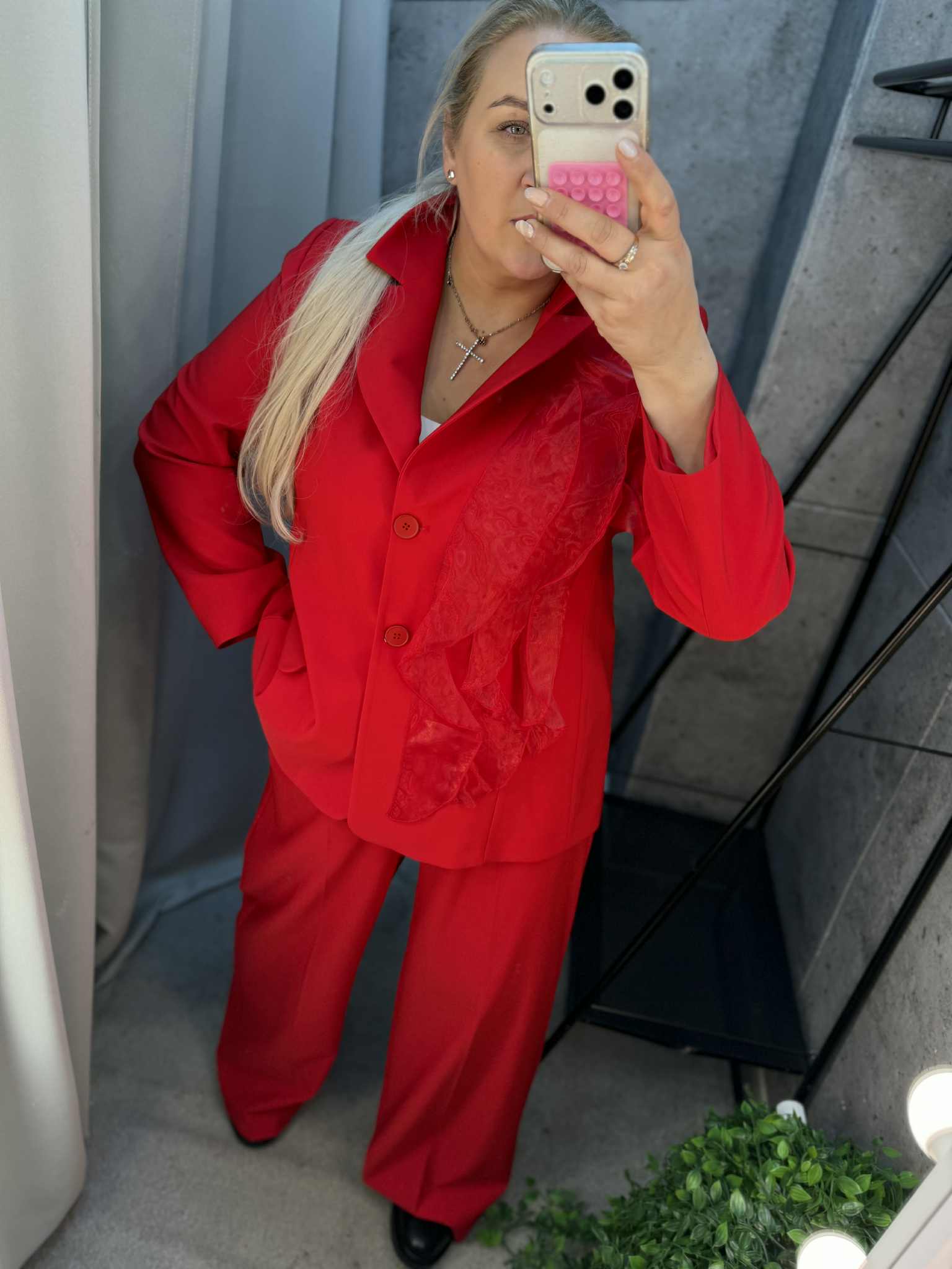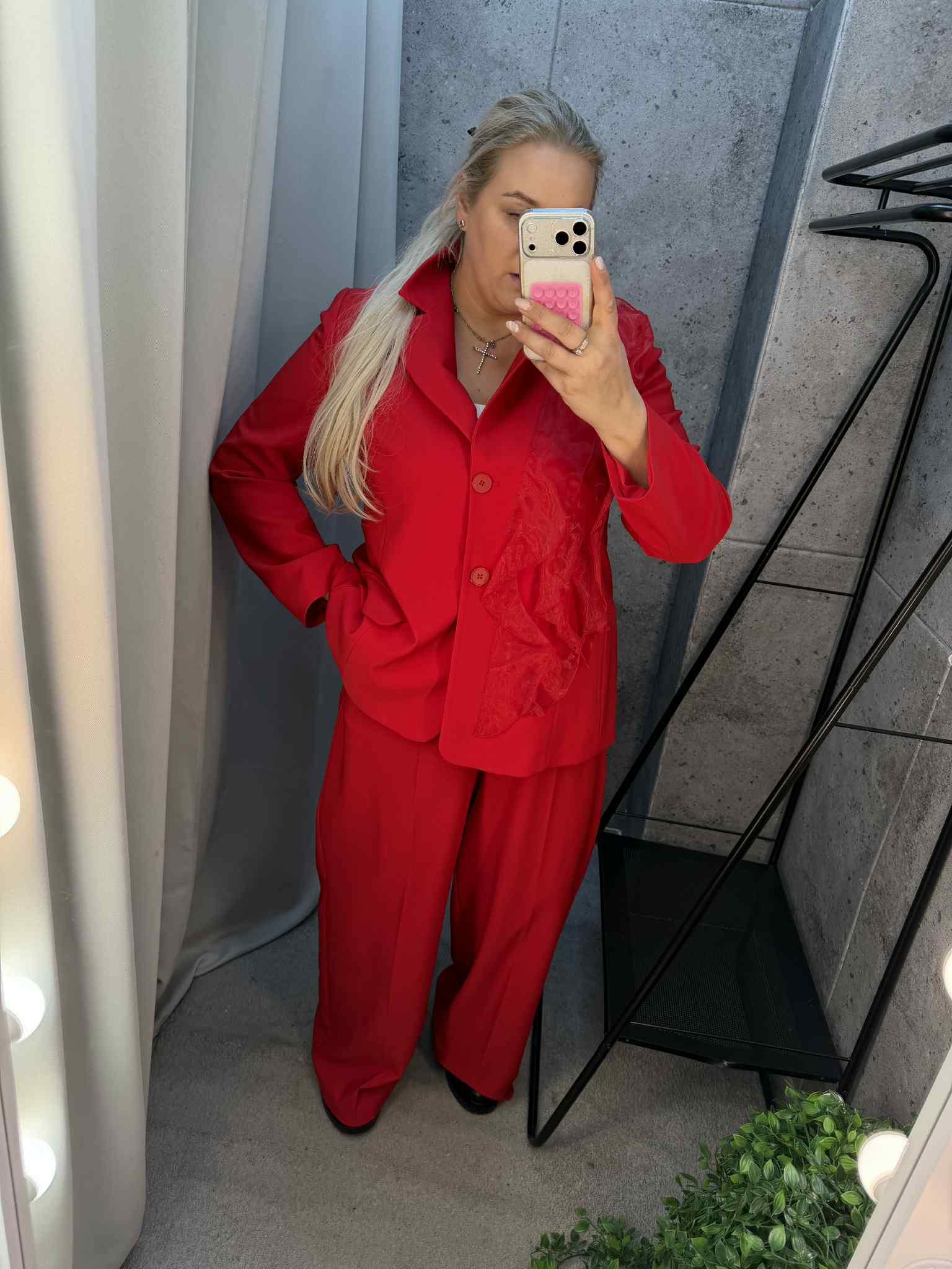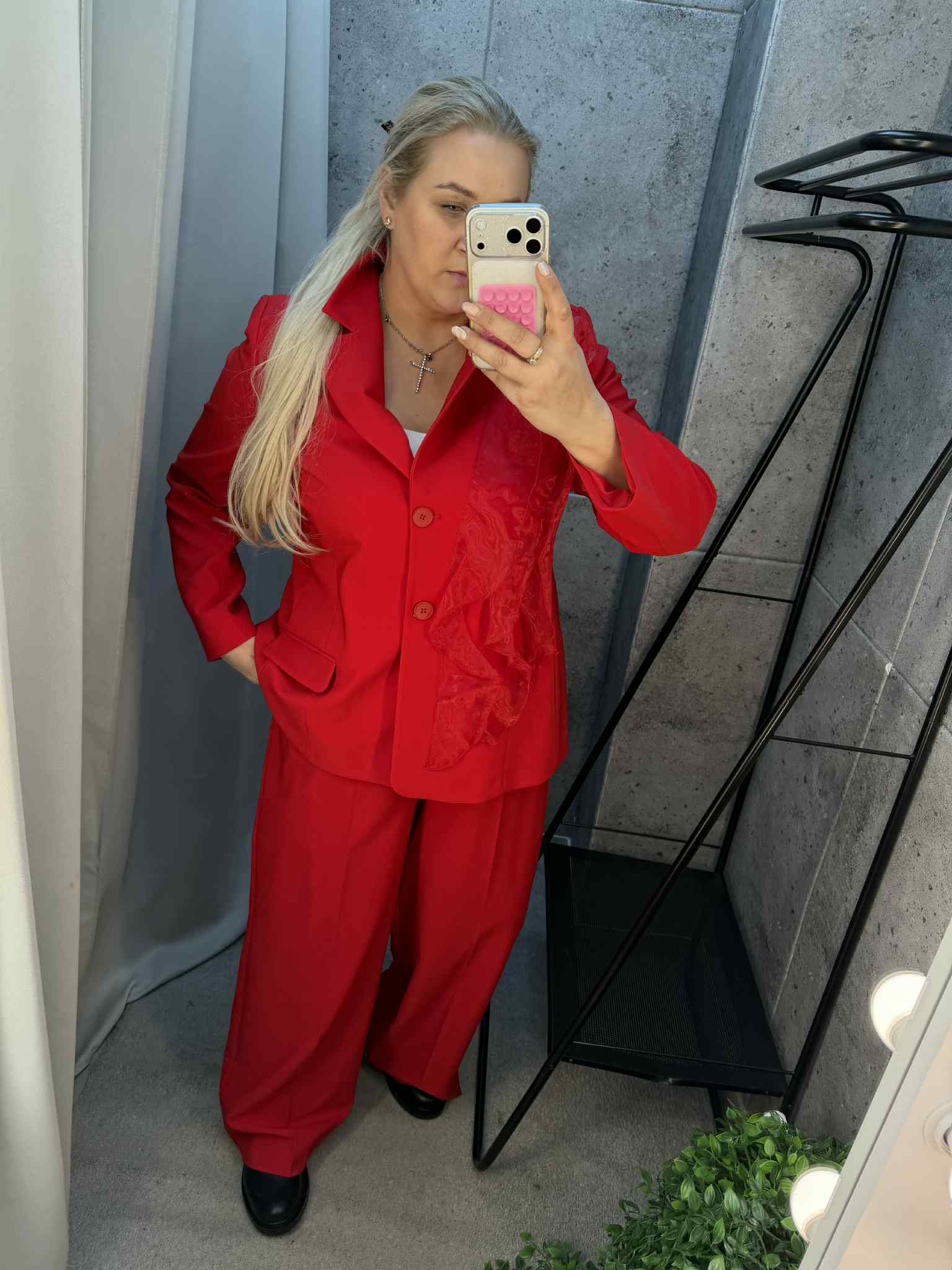Kostiumas 48 dydis. Sudėtis - 88% poliamidas, 12% elastanas. Švarkas ilgis - 75, pečiai - 44, krūtinė - 62/63, liemuo - 61/62, klubai - 66/67, rankovės ilgis - 65, rankovės plotis- 22/23. Kelnės ilgis - 111, juosmuo - 44/57, klubai - 61/71, šlaunis - 41/46, blauzda -- 37/42.