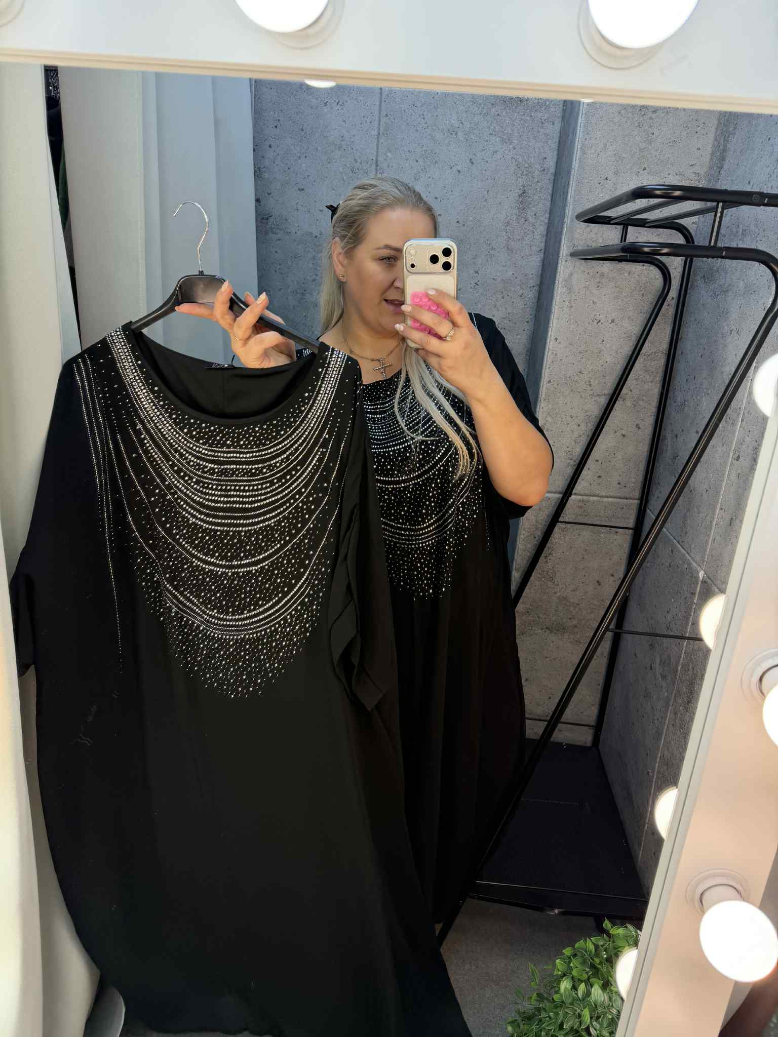 Sodri juoda kimono suknelè didesniems dydžiams.